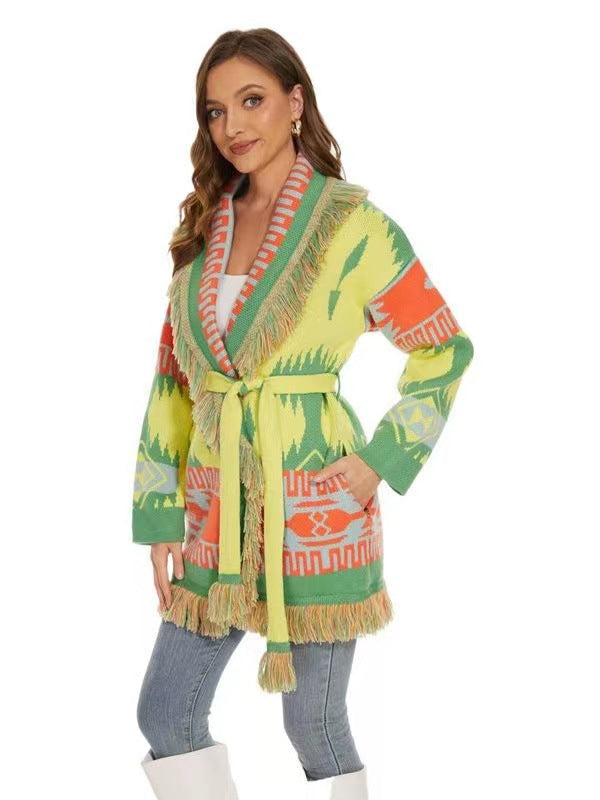 Fashion Bohemian/BOHO Stylish Multicolour Icon Knitted Belted Cardigan