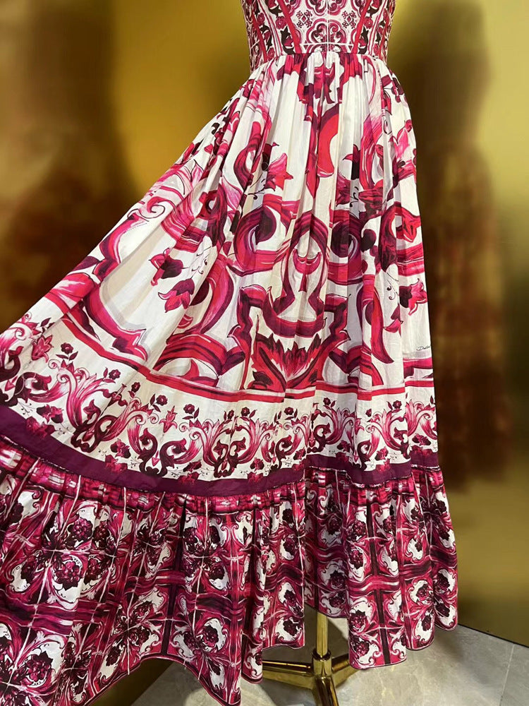 Fashion Designer Summer Cotton Dress Women Spaghetti Strap Sleeveless Flowers Print Vintage Party Backless Long Dress