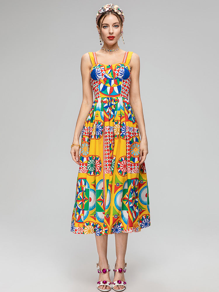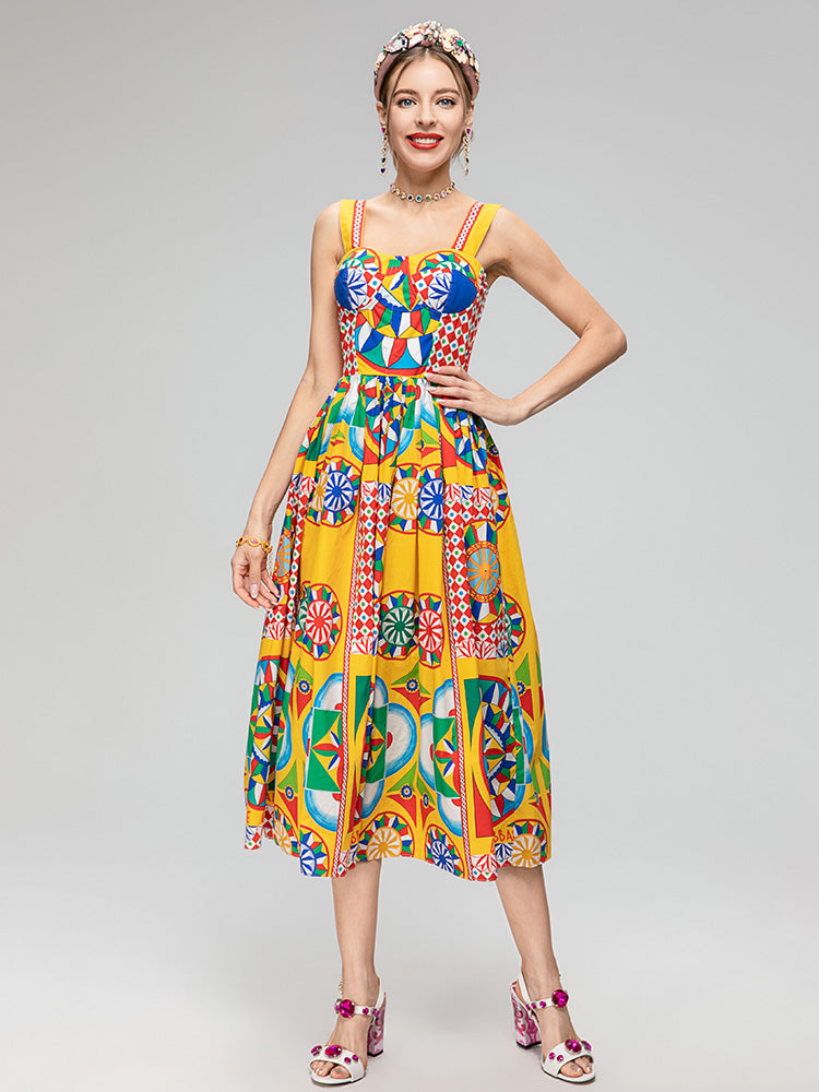 Summer Fashion Designer Beach Dress Women's Bohemia Pure Cotton High Waist Print Crumple Slim Fit Dress