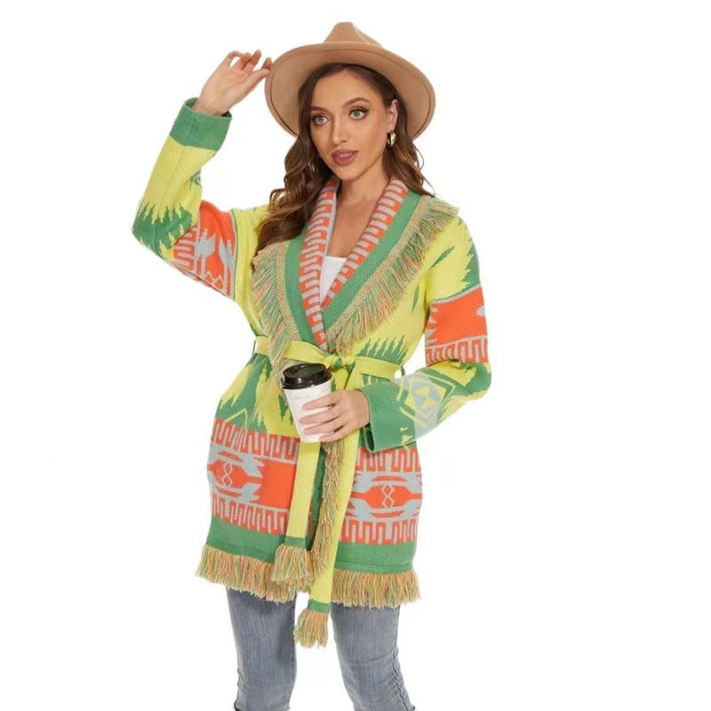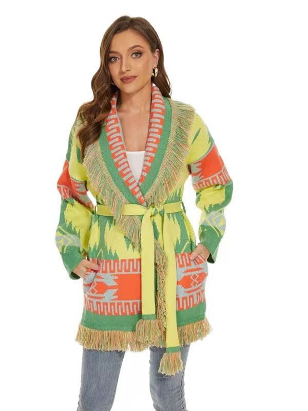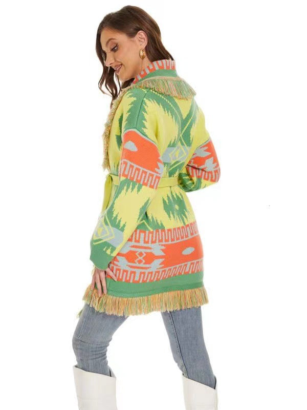 Fashion Bohemian/BOHO Stylish Multicolour Icon Knitted Belted Cardigan