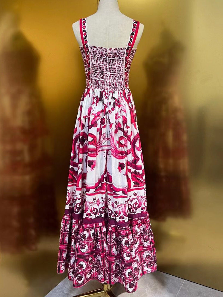 Fashion Designer Summer Cotton Dress Women Spaghetti Strap Sleeveless Flowers Print Vintage Party Backless Long Dress