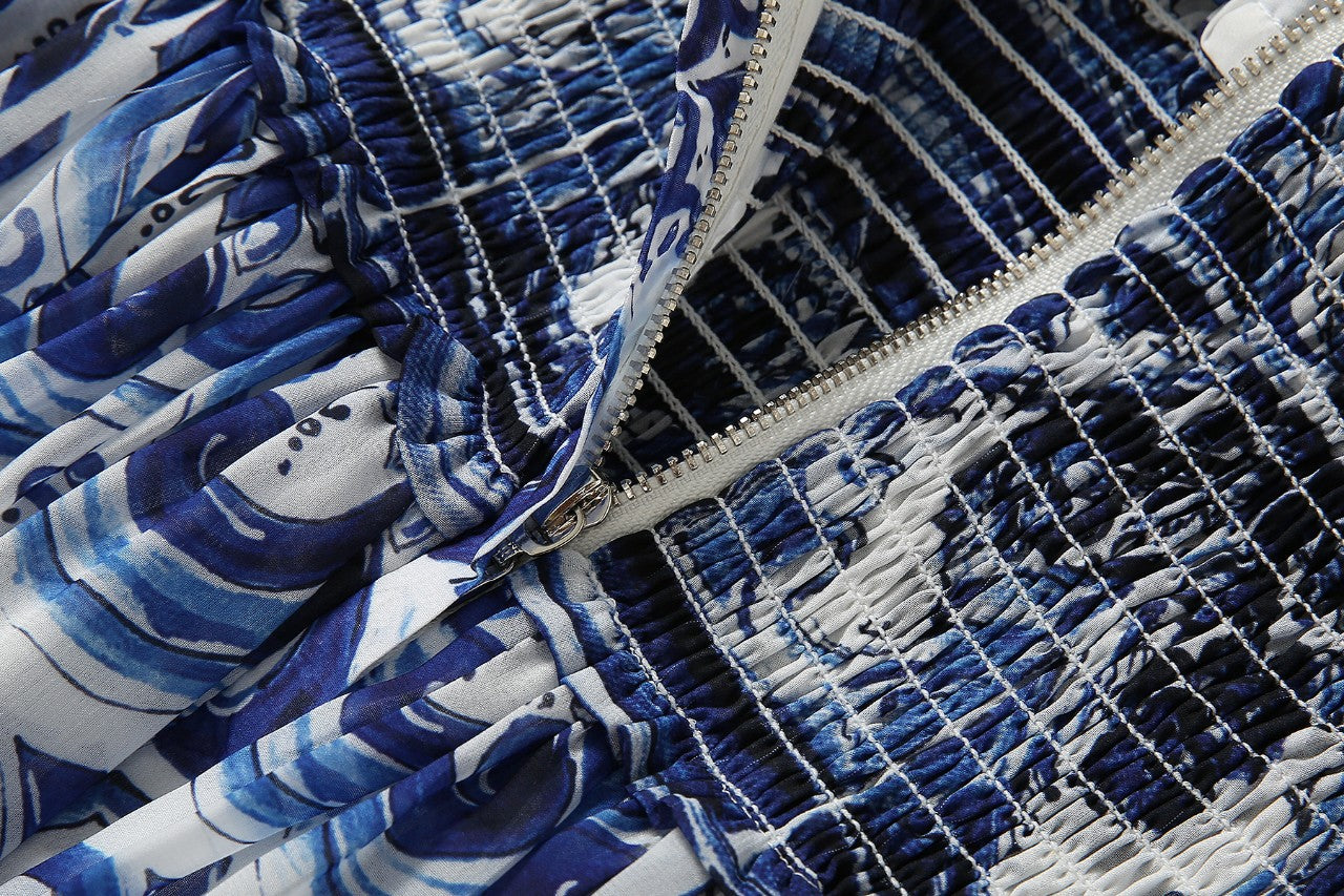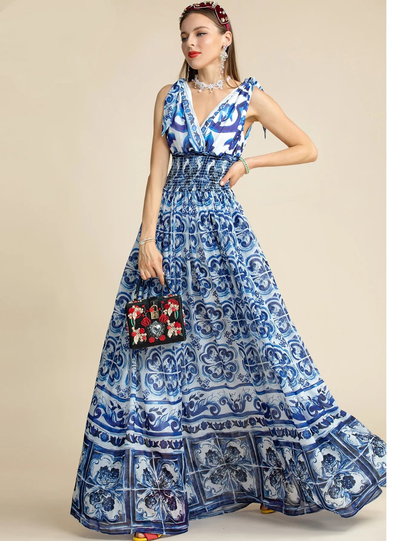 Fashion Women "Majolica-print" Long Maxi Dress With V Neck& Elastic waist