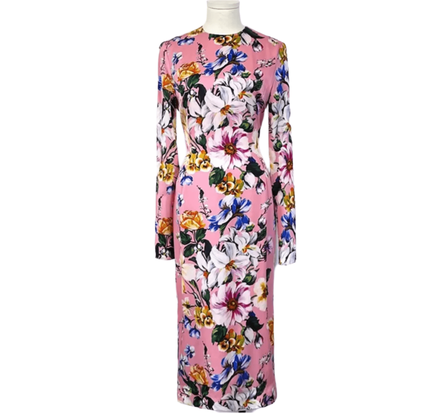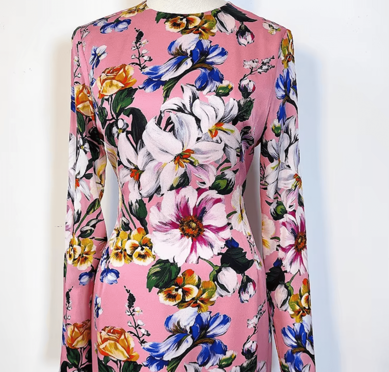 Italian Designer Magnolia Print 100% Silk Long Sleeve Midi Dress – Elegant Women’s Luxury Fashion