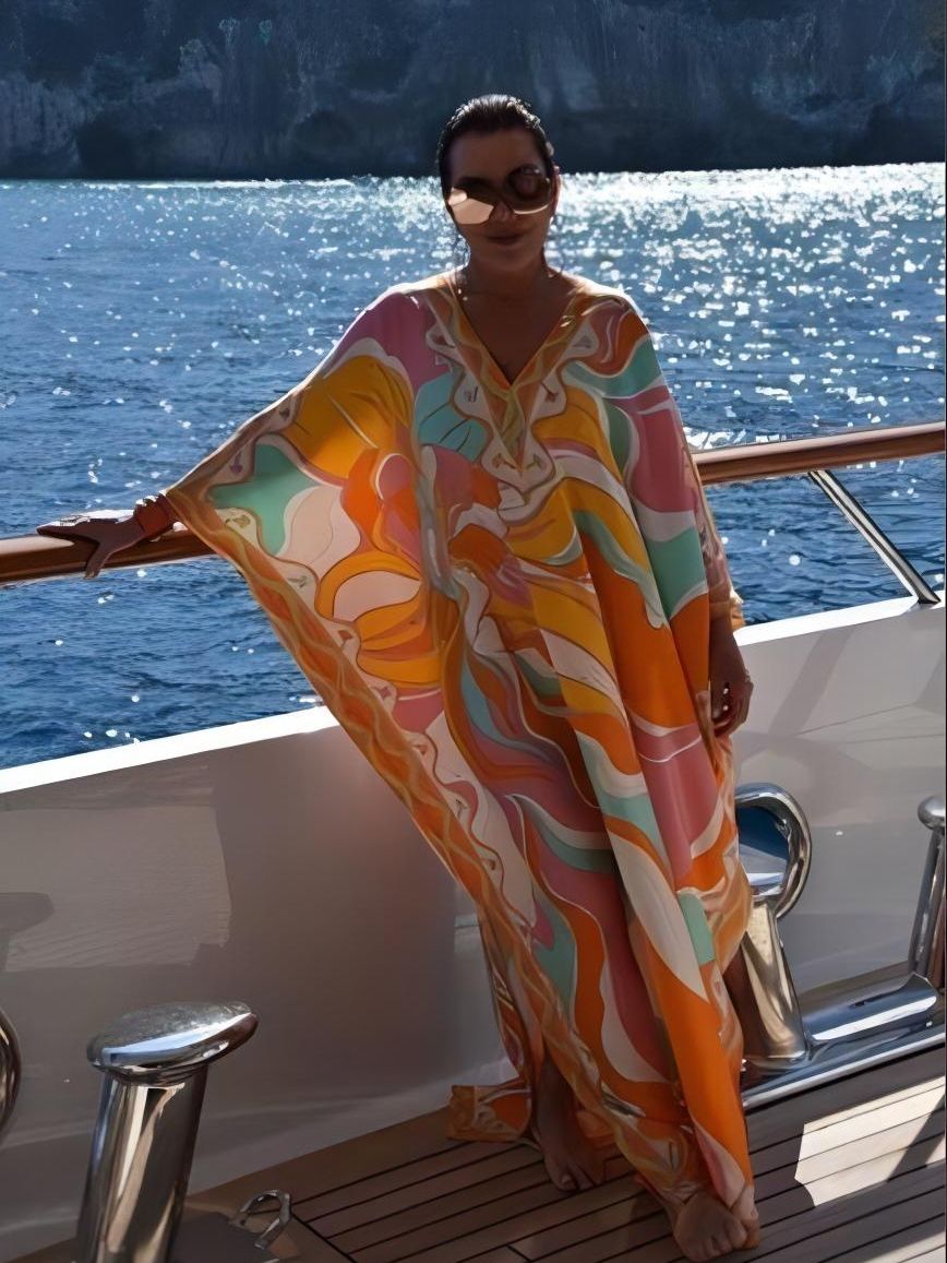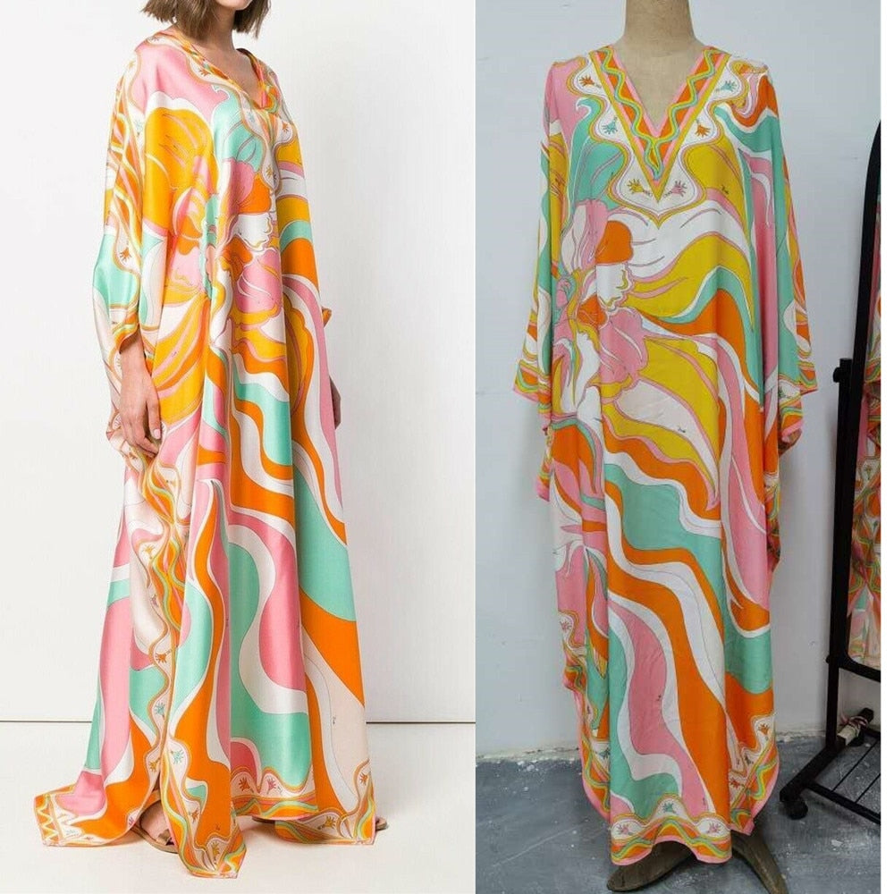 Italy Stylish Designer Inspired Women Jersey Silk Kaftan Dress Oversize V-Neck Long Maxi Dress Swimsuit Print Cover Orange