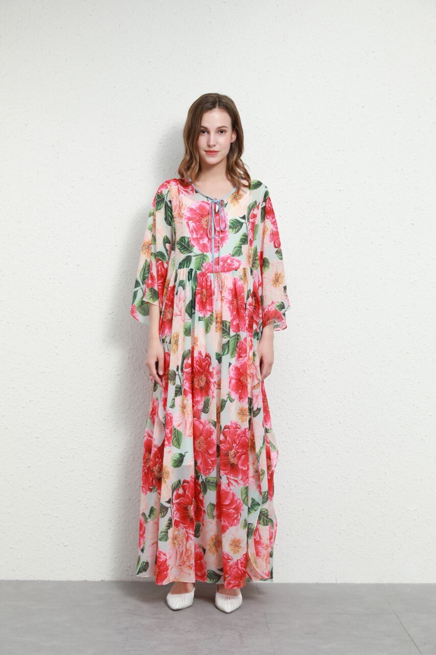 Luxury Designer Inspired Fashion Women Foral Camellia-Print Chiffon Kaftan Dress Loose Long Maxi Dress