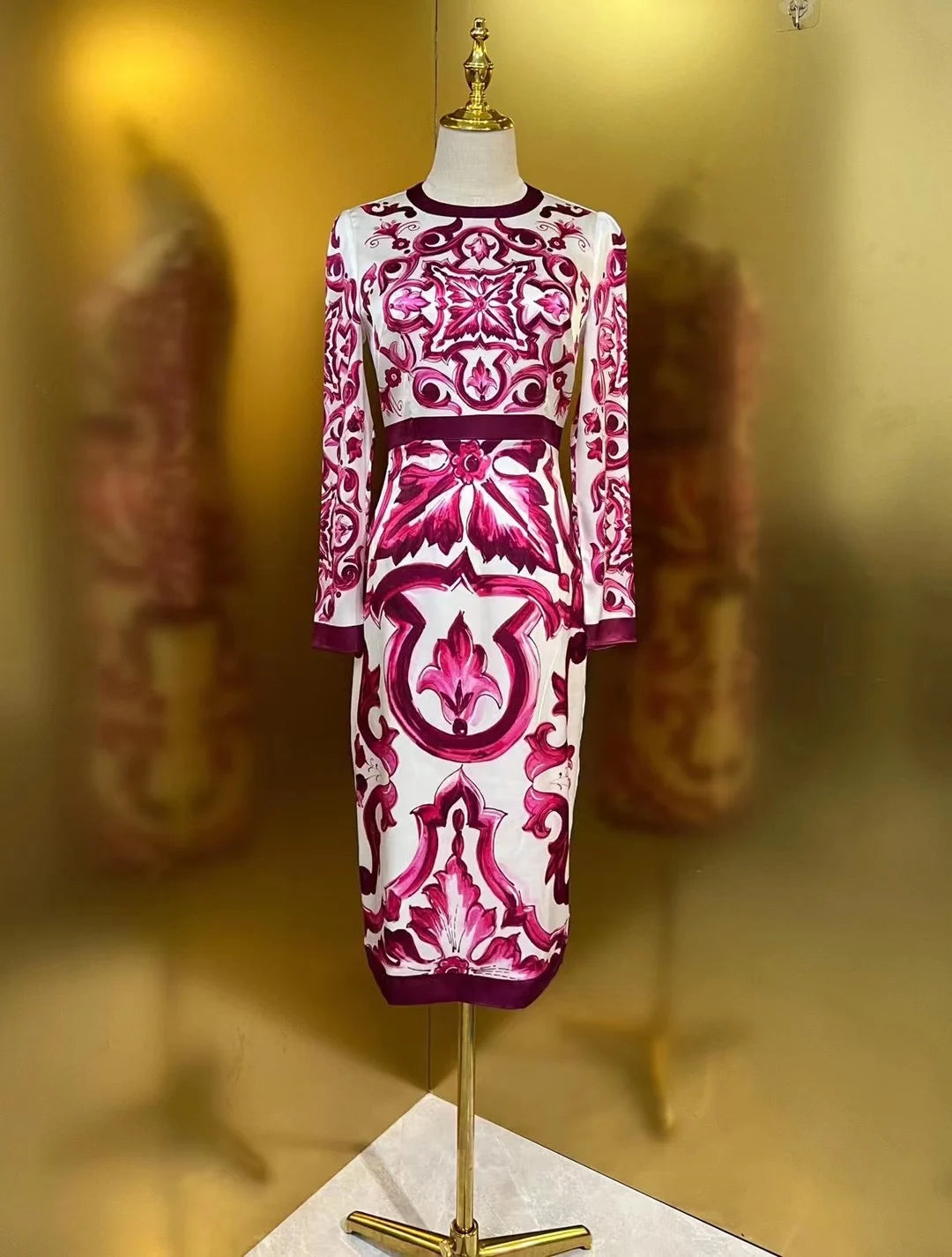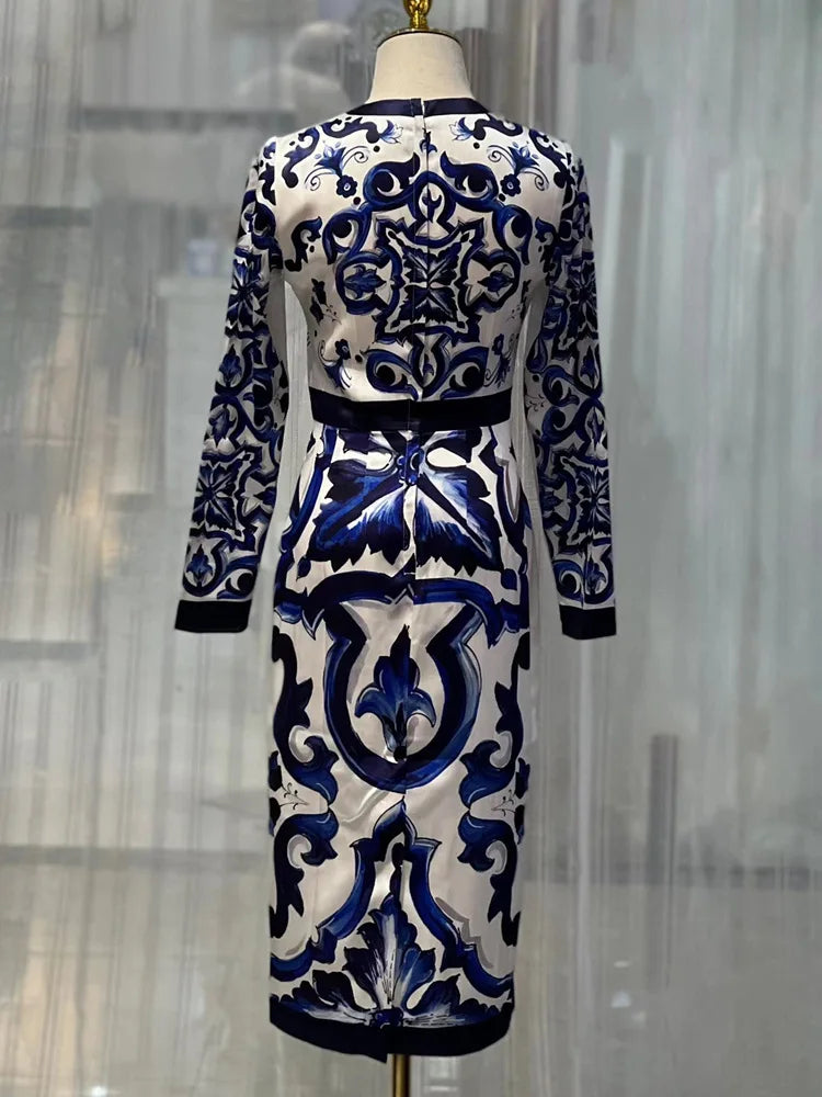 Luxury Designer Inspired Fashion Women Long Sleeve 100% Silk High Quality Midi Dress With Blue And White Porcelain Printed