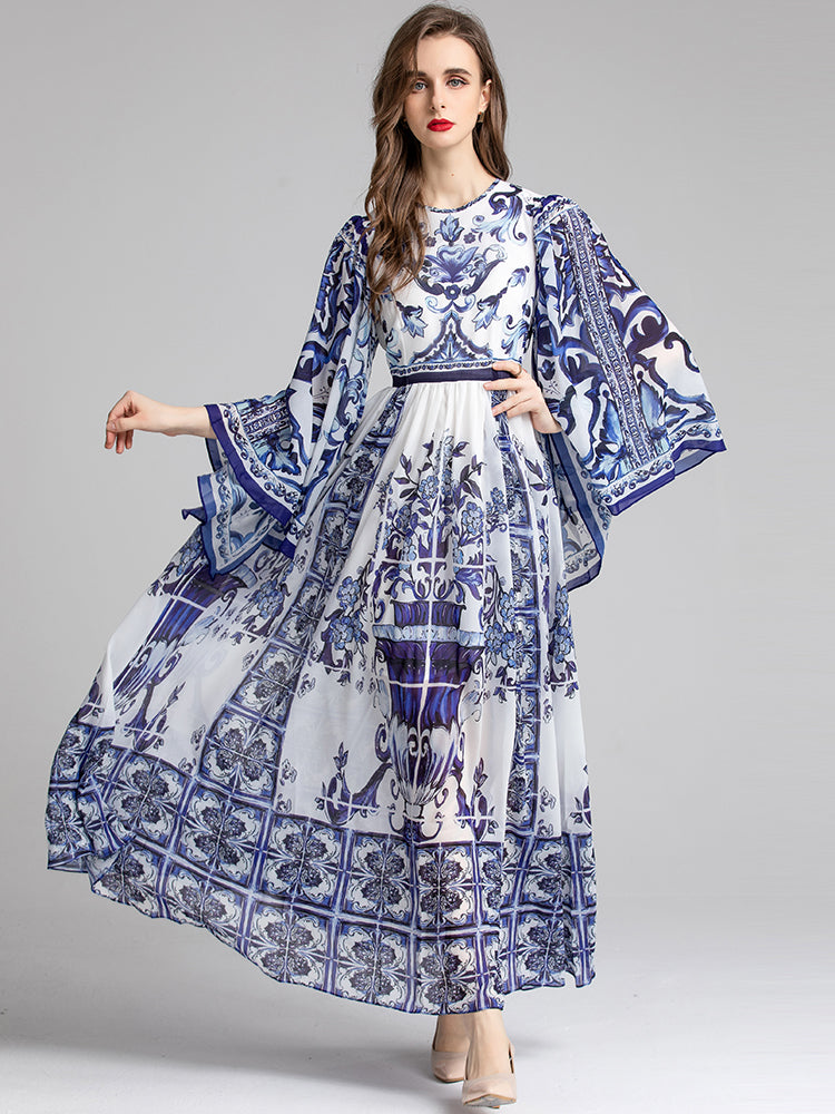 Summer Fashion Designer Women“Majolica-print ”Dress Batwing Sleeve Blue and White Bohemian Long Maxi Dress