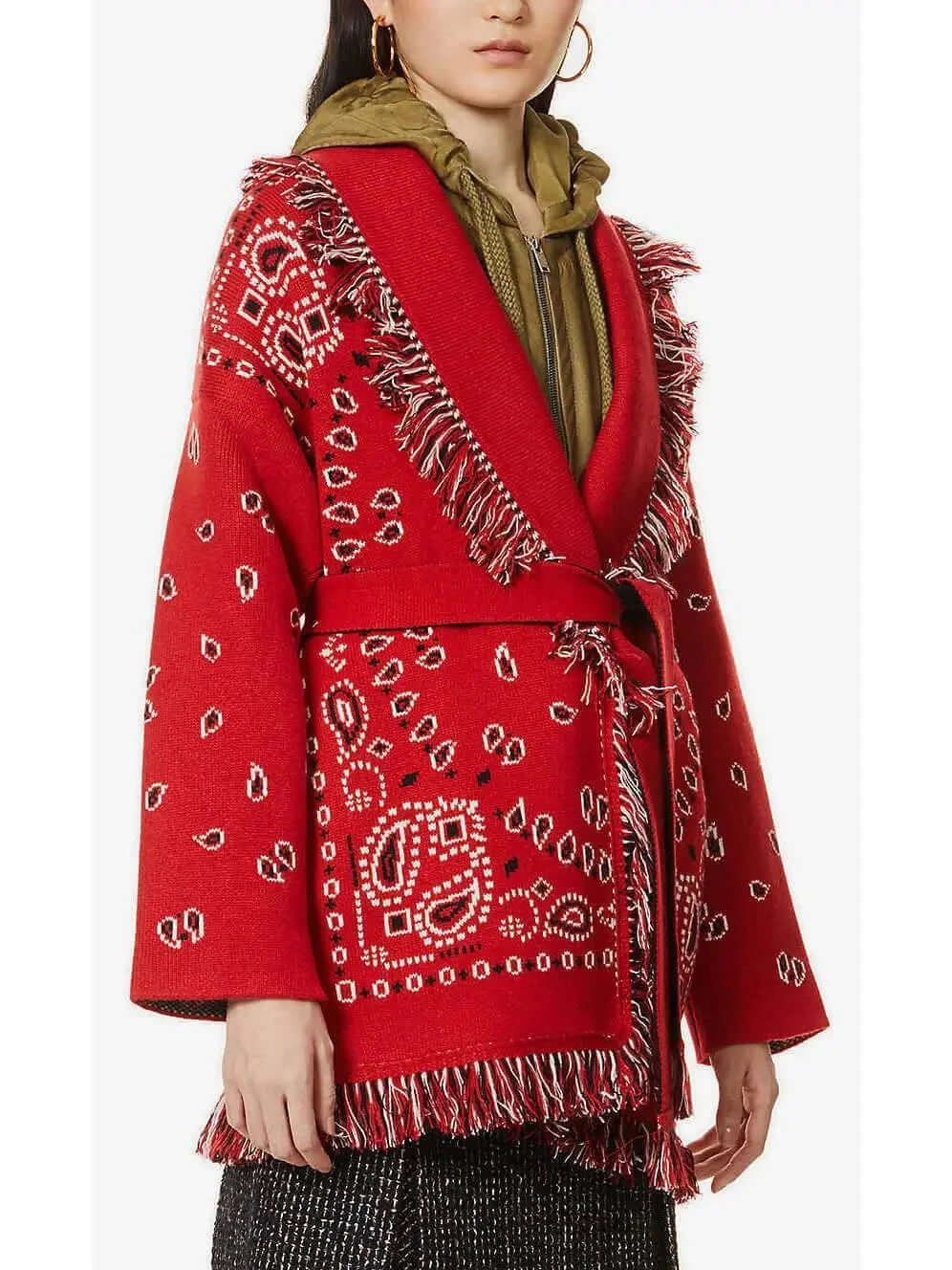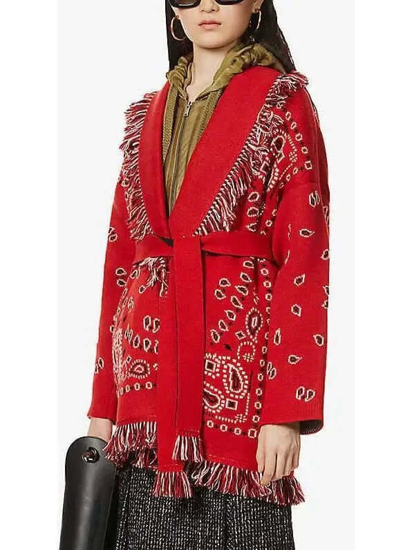 Luxury Designer Inspired Red Jacquard Long Cardigan for Women | Cashmere Wool Blend Winter Coat for Fall & Holiday Parties