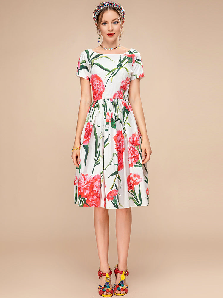 New Fashion Runway Summer Cotton Dress Womens O-neck Short sleeve Flower print Party Elegant Midi Dress