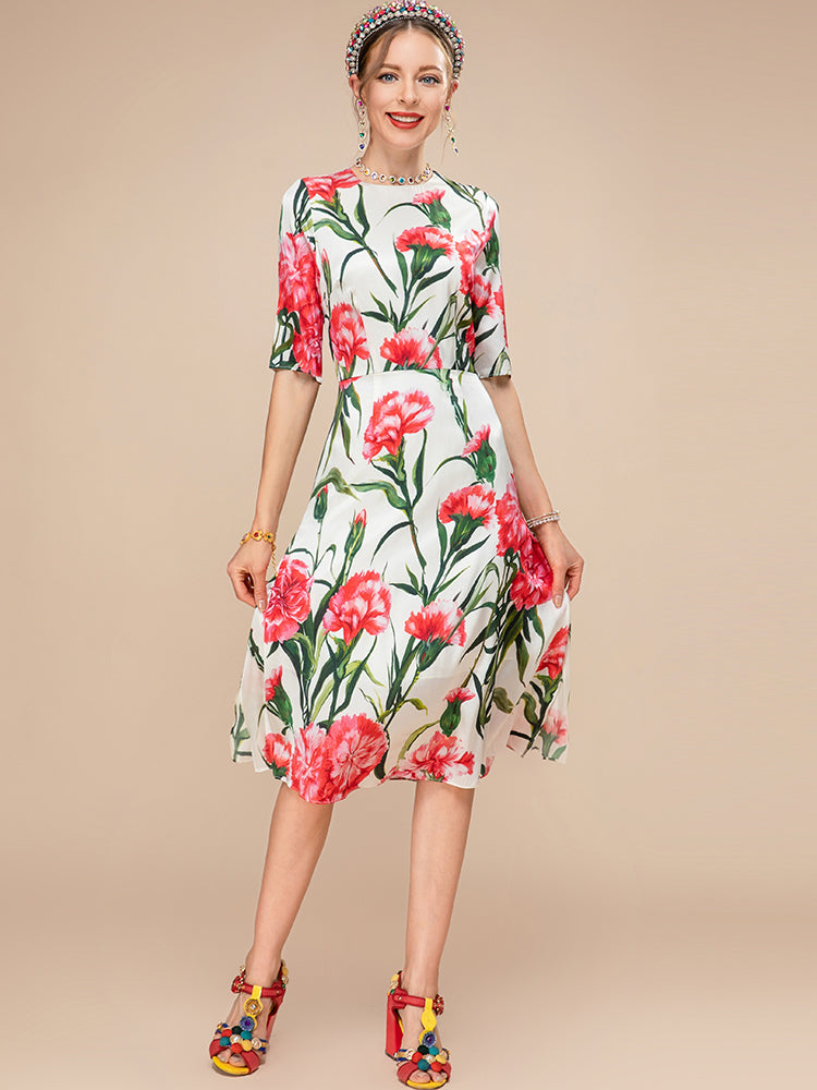 New Fashion Runway Summer Silk Dress Women Short sleeve High waist Flower Print Elegant Holiday Party Dress