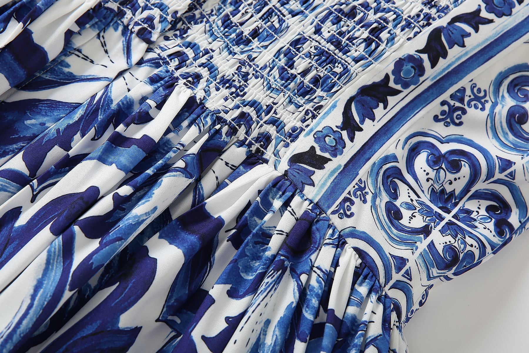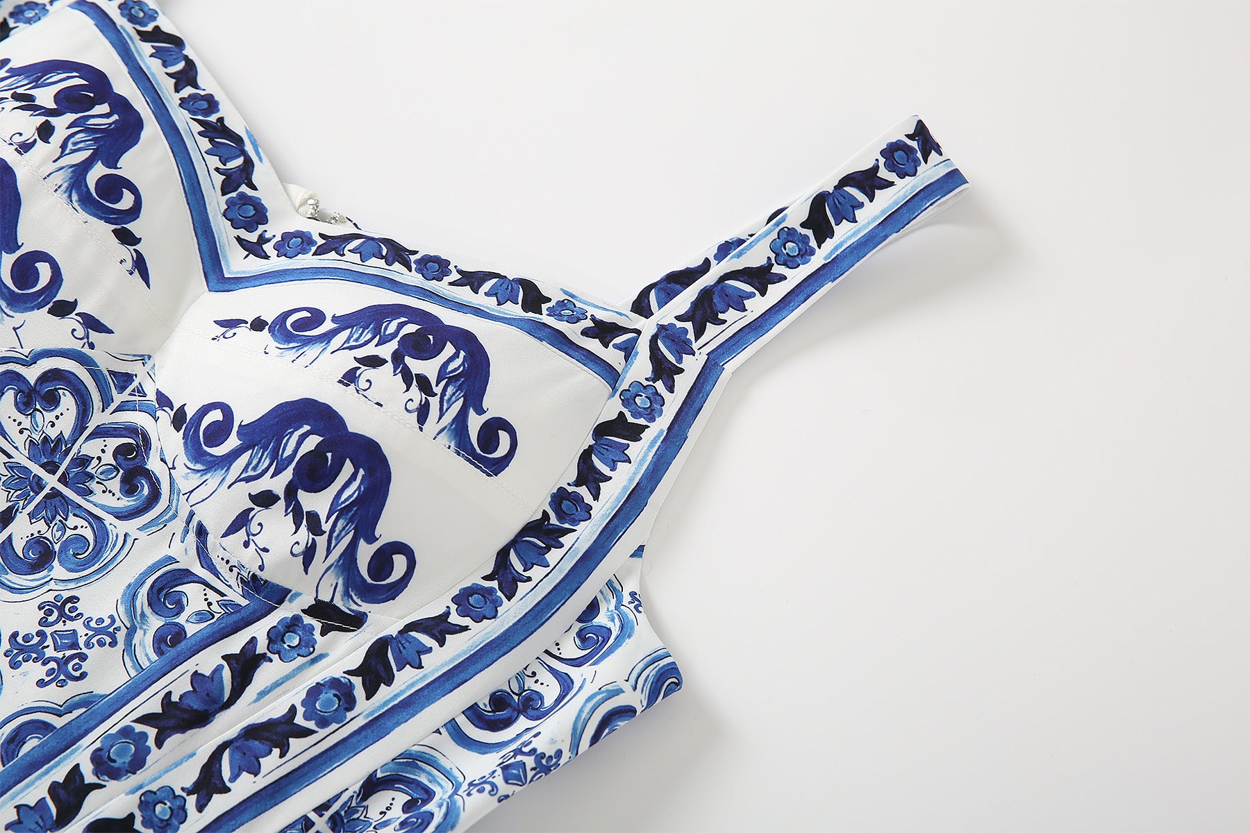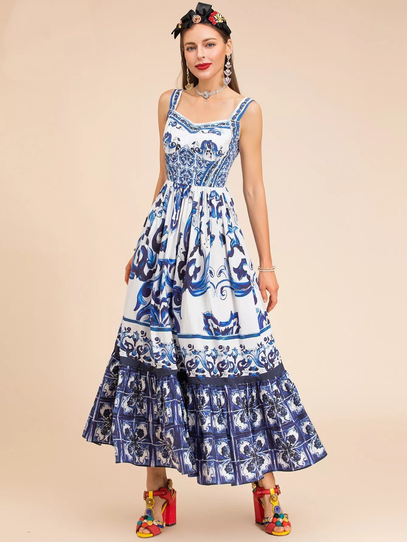 Summer Women Majolica-print Spaghetti Strap CottonMidi Dress