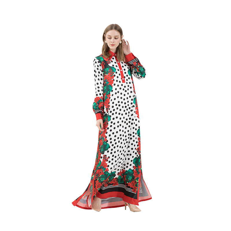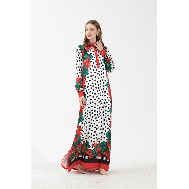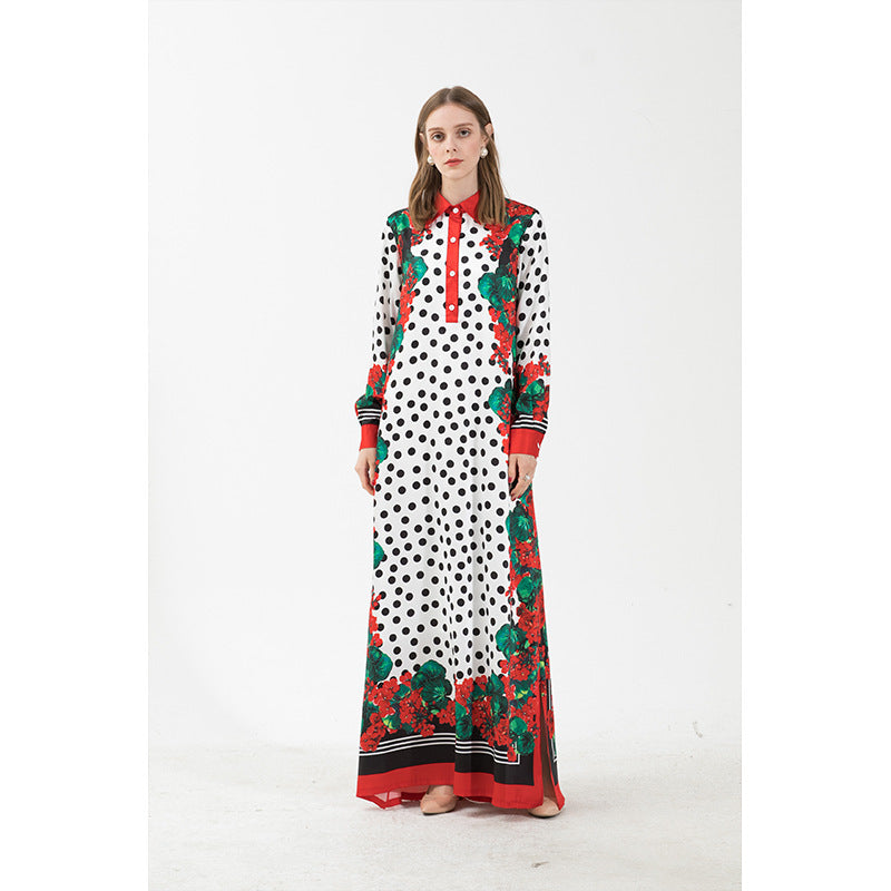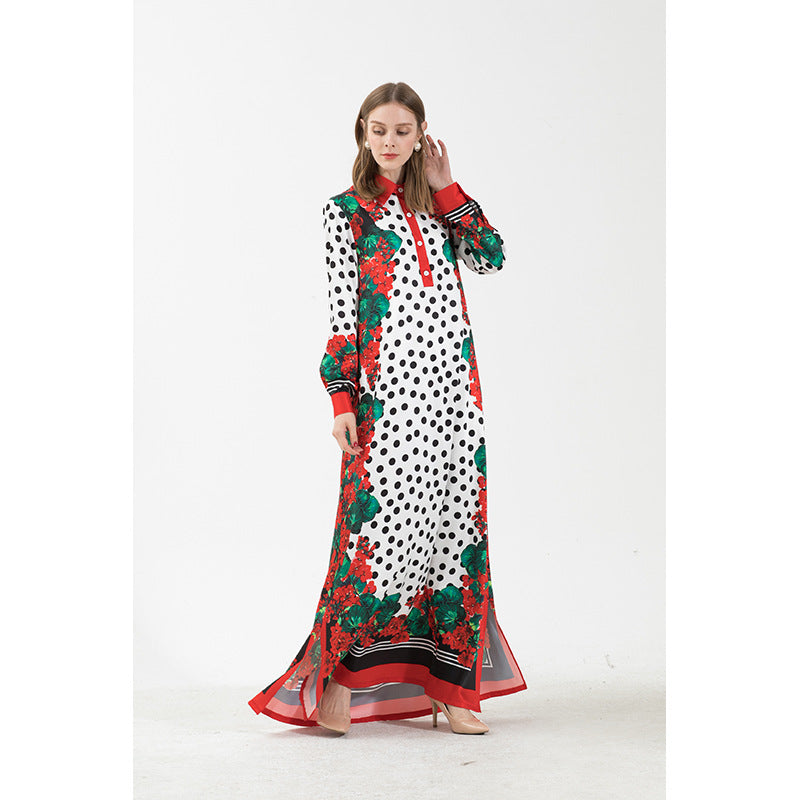 White & Black Floral “Polka Dot“ Printed Maxi Shirt Kaftan Dress