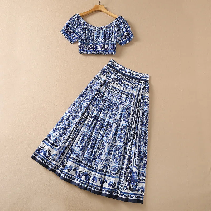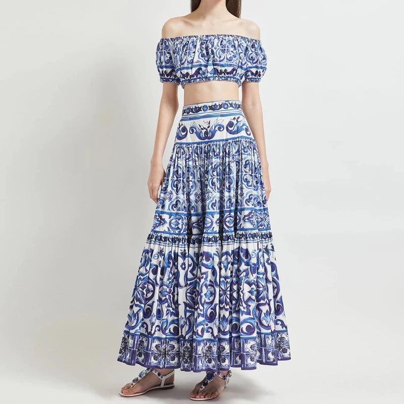 HIGH QUALITY Luxury Fashion Women Blue&White Porcelain Print Off Shoulder Top and Maxi Skirt Summer Set For Female