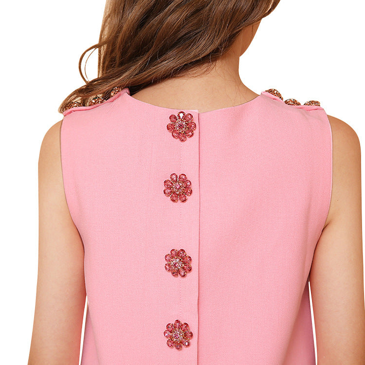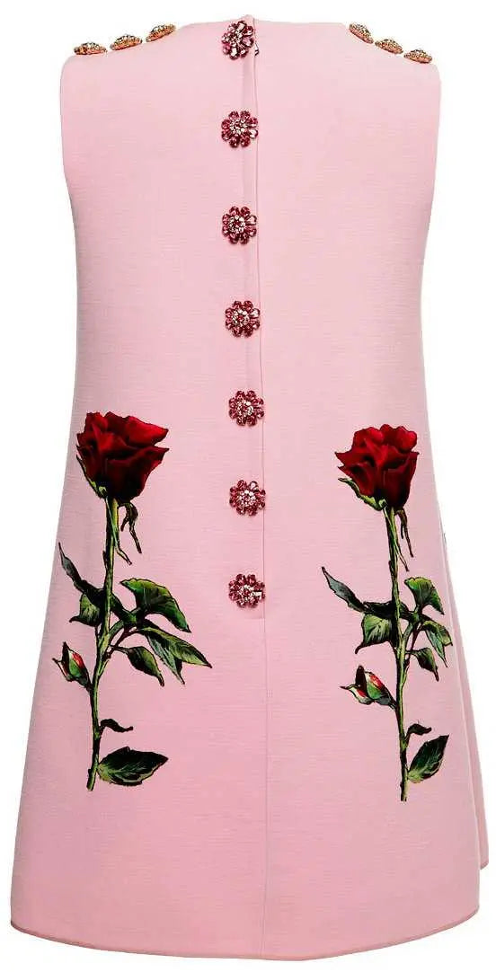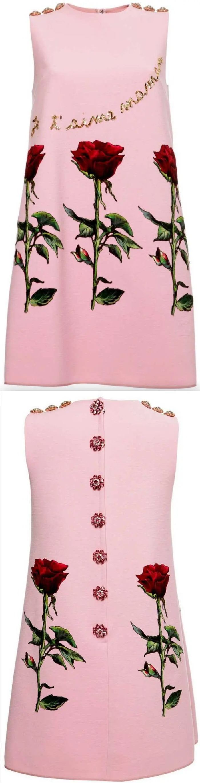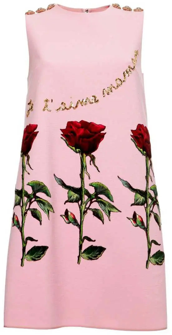 The material of this pink shift dress is lightweight and breathable, made from cotton. this ‘Je T’Aime Maman’ Shift Dress features a round neck, short sleeves, or sleeveless design, as the roses and buttons are the main focal point of the dress's design. and the dress's length falls above the knee, making it a versatile piece suitable for both casual and formal occasions. The rose decoration, coupled with the crystal buttons, creates a unique take on the classic shift dress design.